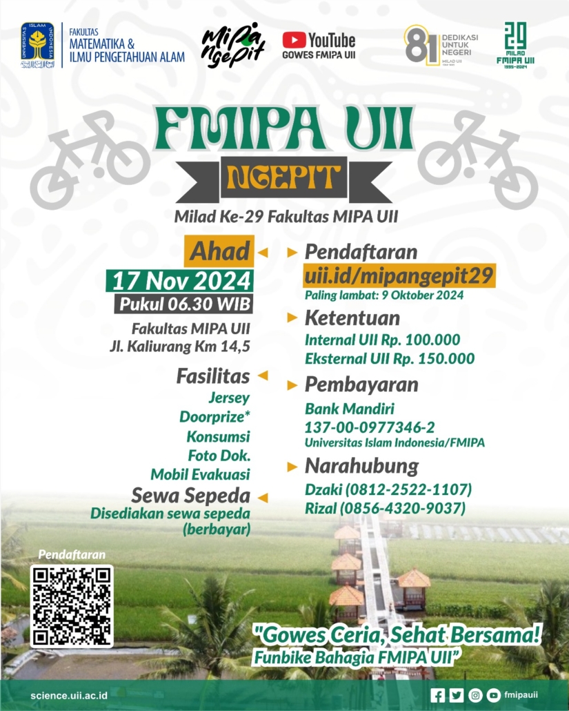 Dalam rangka memeriahkan Milad ke-29 FMIPA UII, kami mengundang seluruh civitas akademika UII dan masyarakat umum pecinta gowes untuk ikut serta dalam acara MIPA Ngepit 2024 “Gowes Ceria, Sehat Bersama”.