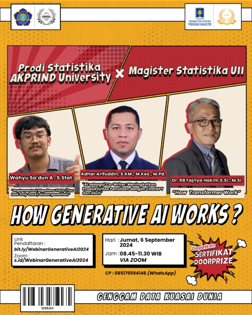 Yogyakarta, 6 September 2024 – Program Studi Statistika AKPRIND University bekerja sama dengan Program Magister Statistika Universitas Islam Indonesia (UII) sukses menggelar webinar bertajuk “How Generative AI Works?”. Acara ini diadakan secara virtual melalui platform Zoom pada Jumat, 6 September 2024, pukul 08.45 hingga 11.30 WIB.