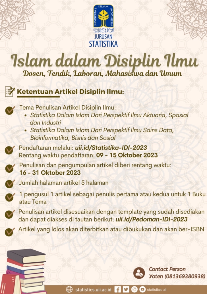 Jurusan Statistika UII mengundang dan mengharapkan Bapak/Ibu/Saudara/i untuk dapat menulis artikel Bunga Rampai Islam Dalam Disiplin Ilmu 2023 dengan ketentuan sebagai berikut: