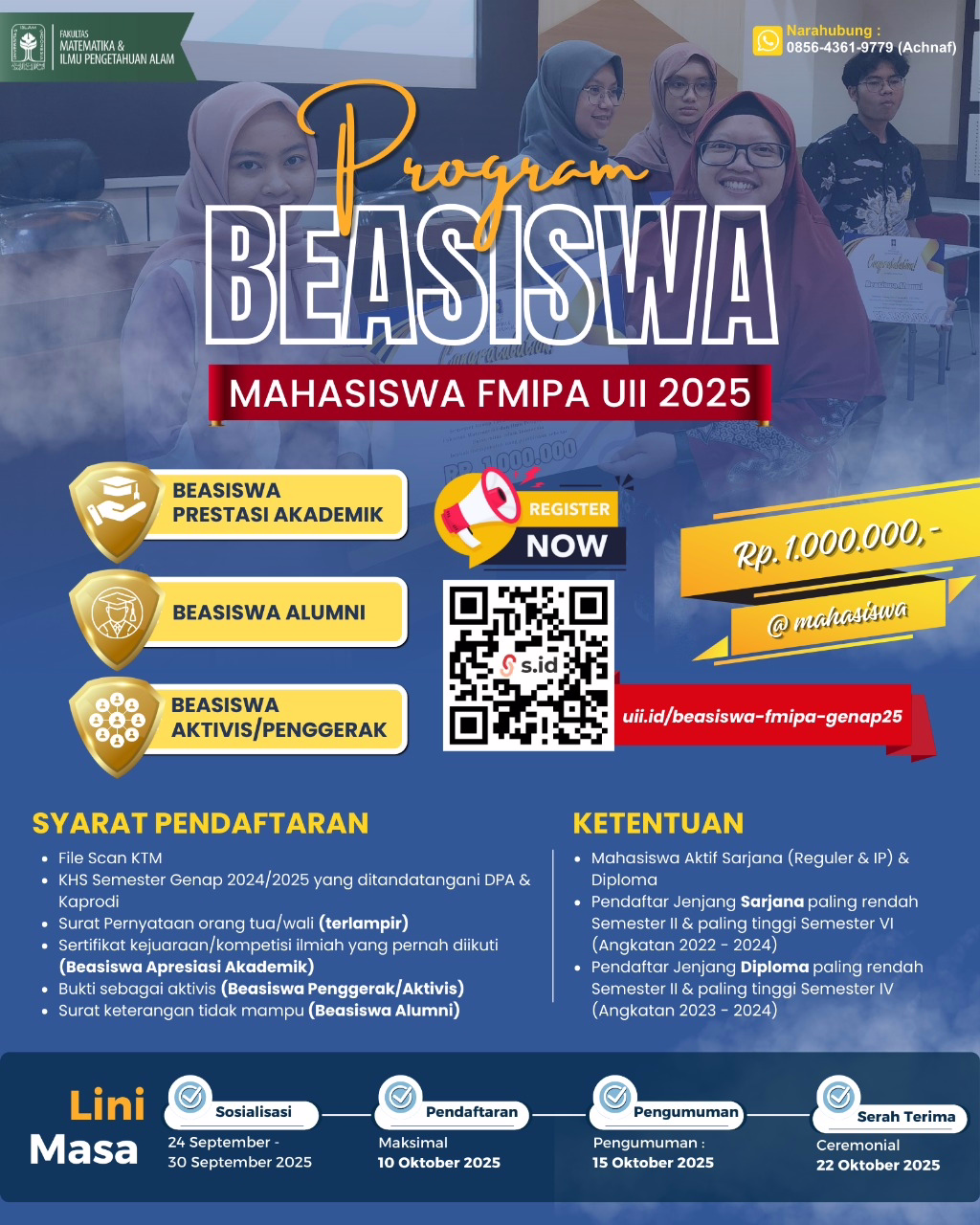 Kabar baik untuk mahasiswa FMIPA UII! Fakultas MIPA membuka kesempatan Beasiswa dengan alokasi Rp 1.000.000/mahasiswa.