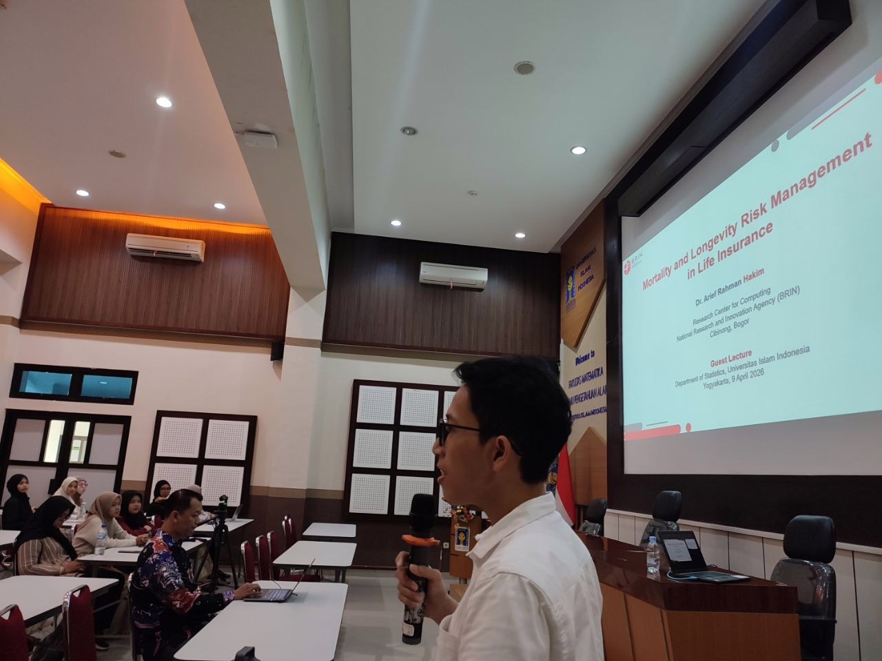 Yogyakarta, 9 April 2026 — Program Studi Statistika, Fakultas Matematika dan Ilmu Pengetahuan Alam (FMIPA), Universitas Islam Indonesia (UII) menyelenggarakan kuliah tamu bertajuk “Mortality and Longevity Risk Management in Life Insurance” pada Kamis, 9 April 2026, pukul 09.36–12.10 WIB di Ruang Auditorium Lantai 4 FMIPA UII. Kegiatan yang dipandu oleh Mujiati Dwi Kartikasari, S.Si., M.Sc. ini menghadirkan Dr. Arief Rahman Hakim dari Badan Riset dan Inovasi Nasional (BRIN) Cibinong, Bogor, sebagai narasumber.